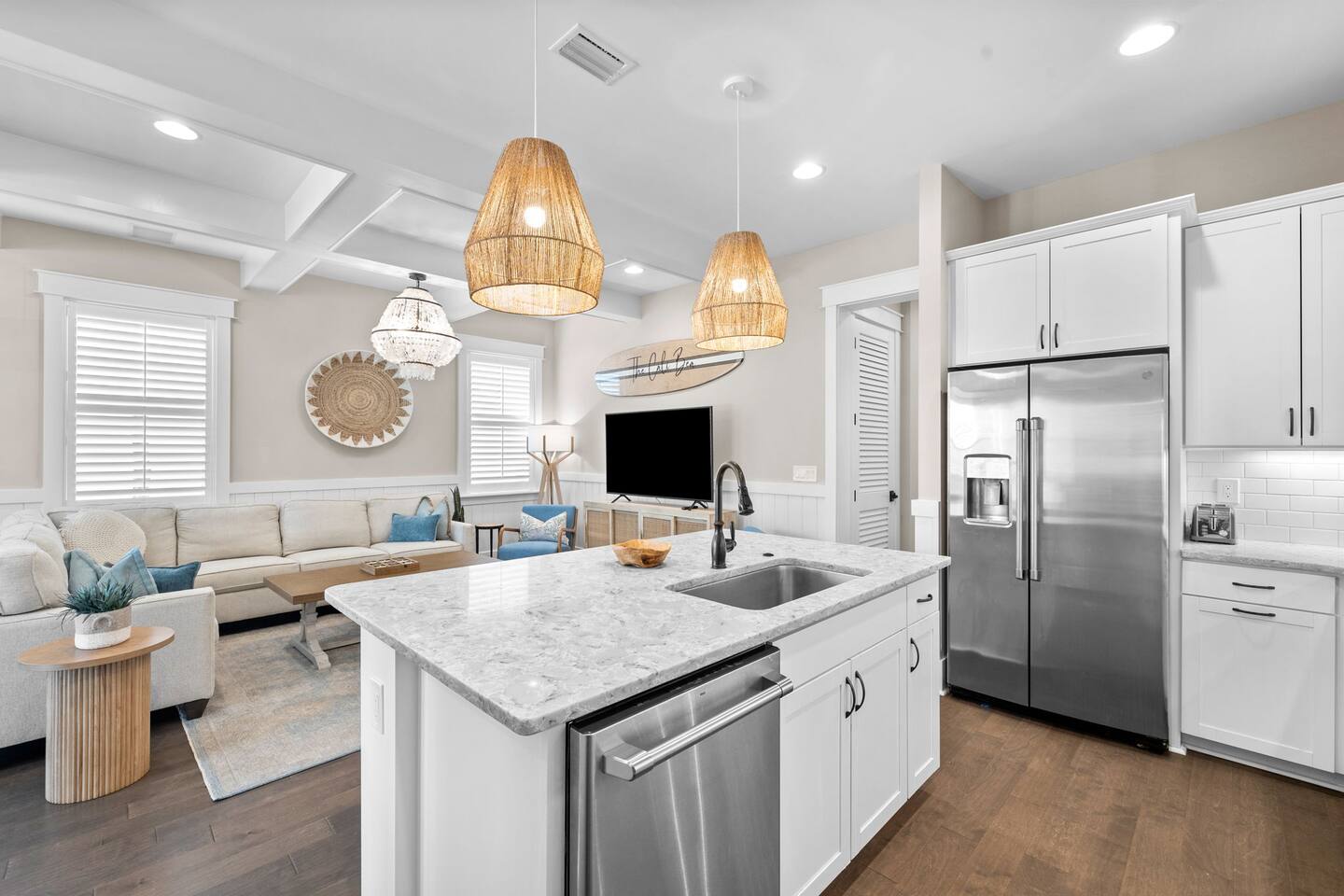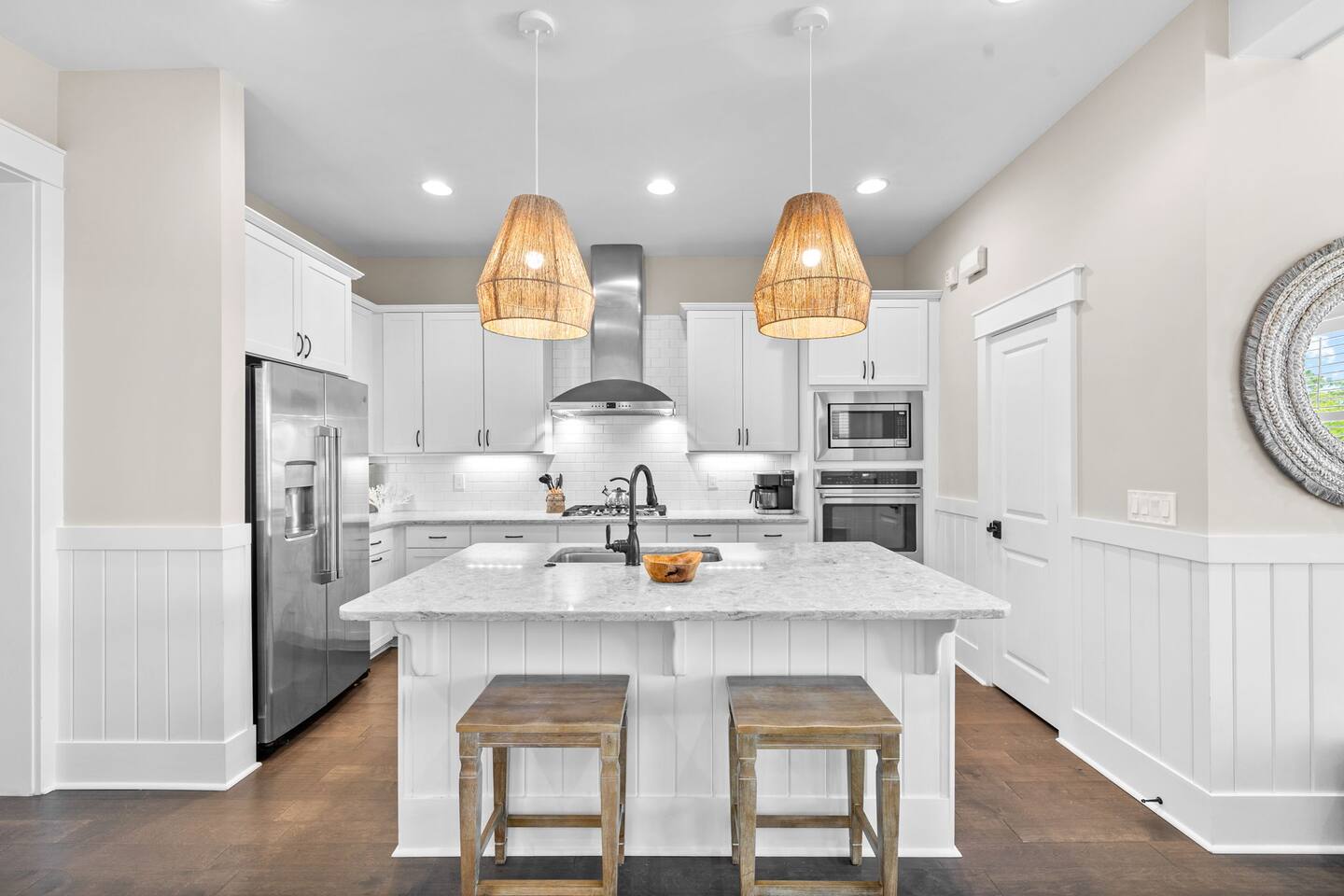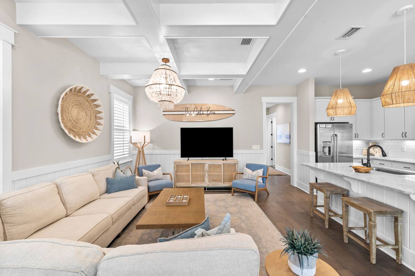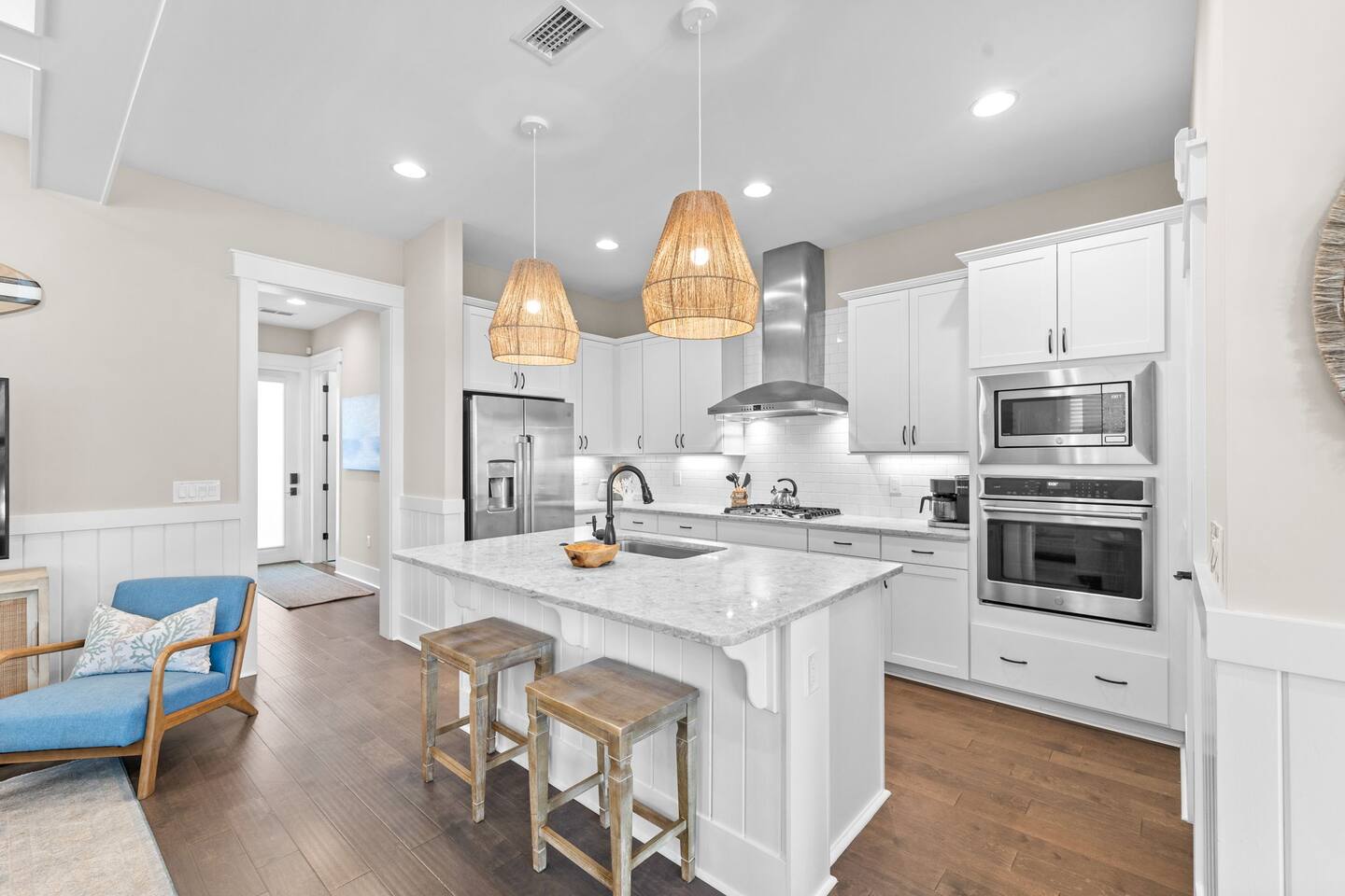 WHAT OUR GUEST ARE SAYING.... ★★★★★ "This is by far the best equipped beach house I’ve ever rented..." ★★★★★ "The Cali Bea is beautiful & very well equipped with high quality furnishings, amenities & decor There's absolutely nothing lacking in the kitchen or anywhere in the house..." ★★★★★ "House is gorgeous and the location is great. Nice bike ride to the beach from the bike trail and not a far ride in the golf cart to the beach." ★★★★★ "We LOVED this place and simply did not want to leave." ★★★★★ "Great location and a very clean home. We enjoyed the golf cart and bikes." . HOUSE DETAILS . ■ KITCHEN AND DINNING (Main Level) ✢ Dinning ware, cups and glasses ✢ Common cooking utensils, pots, pans, baking pans ✢ Keurig Combo Kcup/Drip Coffee, BYO Coffee ✢ Crock pot, Kettle, Toaster, Rice Maker, Blender ✢ Single Oven ✢ Gas Range ✢ Large Microwave ✢ Refrigerator ✢ Dishwasher ✢ Dining table seats 8 (5 chairs + Large Bench for 3) ✢ Island with 2 counter top stools ✢ Children Dining Wear ✢ Gas Grill on back porch . ■ LIVING ROOM (Main Level) ✢ Large screen Roku TV ✢ Large Sectional Couch ✢ 2 Chairs ✢ Comfy Pillows and throw blankets ✢ Access to 2 bathrooms (1/2 bath + Full Bath) on the main level ✢ Laptop-friendly workspace . ■ BATHROOM (2 in Main level, 2 in Second Level) ✢ Starter packages of soap/body wash/conditional shampoo ✢Toilet papers as startup supply ✢ Clean towels ✢ Washer and Dryer on main level . ■ MASTER BEDROOM (Main Level) ✢ King bed ✢ En suite bathroom with Walk-in tile shower ✢ 2 Night stands, 2 Lamps, USB chargers and sound machine ✢ Ceiling fan ✢ Large Dresser ✢ Closet . ■ MASTER BEDROOM (Second Level) ✢ King bed ✢ En suite bathroom walk in tile shower ✢ Large screen Roku TV ✢ 2 Night stands, 2 Lamps, USB chargers and sound machine ✢ Ceiling fan ✢ Large Dresser ✢ Large Walk In Closet . ■ GUEST BEDROOM (Second Level) ✢ Queen bed ✢ Shared Double Sink, Shower Tub Bathroom ✢ 2 Night stands, 2 Lamps, USB chargers and sound machine ✢ Ceiling fan ✢ Closet . ■ BUNK ROOM (Second Level) ✢ Queen over Queen Bunk Bed - New Dec 2023 ✢42" Roku TV in built in each bunk ✢LED lighting ✢ Shared Double Sink, Shower Tub Bathroom ✢ Closet . ■ SITTING AREA (Second Level) ✢ Work Space or hang out area. ✢ Dedicated Work Desk, Chair with Monitor ✢ 2 Swivel rock chairs ✢ Large screen Roku TV . ■ TOP BALCONY ✢Newly screen in porch ✢ Enjoy peaceful scenic views featuring a pond view / fountain ✢ Large Pottery Barn Sectional and Pillows ✢ Large Bed Swing with Pillows ✢2 Polywood Adirondack Rocking Chairs . ■ LOWER BALCONY ✢ Large Pottery Barn Sectional ✢ 4 Seat Polywood Table and Chair Dinning Set . ■ COMPLIMENTARY AMENITIES ✢ 6 Seat Lithium Golf Cart (signed agreement required) ✢ 4 Beach Comber Bikes (signed agreement required) ✢ 2 Child Bike Buggy Trailers (1 single, 1 double) ✢ Beach Chairs, Beach Umbrella, Small Cooler, Beach Wagon ✢ Misc Beach Toys . ■ KID FRIENDLY AMENITIES ✢ High Chair, Toddler Tower, Pack N Play, Safety Gate ✢ Board games, Small toys, Books, Puzzles. . ■ We provide a starter sets of Soaps, shampoos, toilet paper and paper towels. If additional items are needed, please see near by stores for your convenience. . ■ Condiments, zip locks, coffee are not provided. . ■ NO Beach Towels Provided: Please bring your own beach towels and enjoy the Pools and Beaches. . ■ Nearby Restaurants: Publix Supermarket and Deli, Pizza by the Sea, Fish Out of Water, Chan's Wine World, The Perfect Pig, Great Southern Cafe, The Gathering Spot and Sushi Bar, AmaVida Coffee and Tea, Bud and Alley's, Taco Bar, Barefoot Barbecue, Pickles, Air-Stream Row and more! . ■ Office Business Hours: 9est- 6est 7 days per week on Airbnb Messenger only.